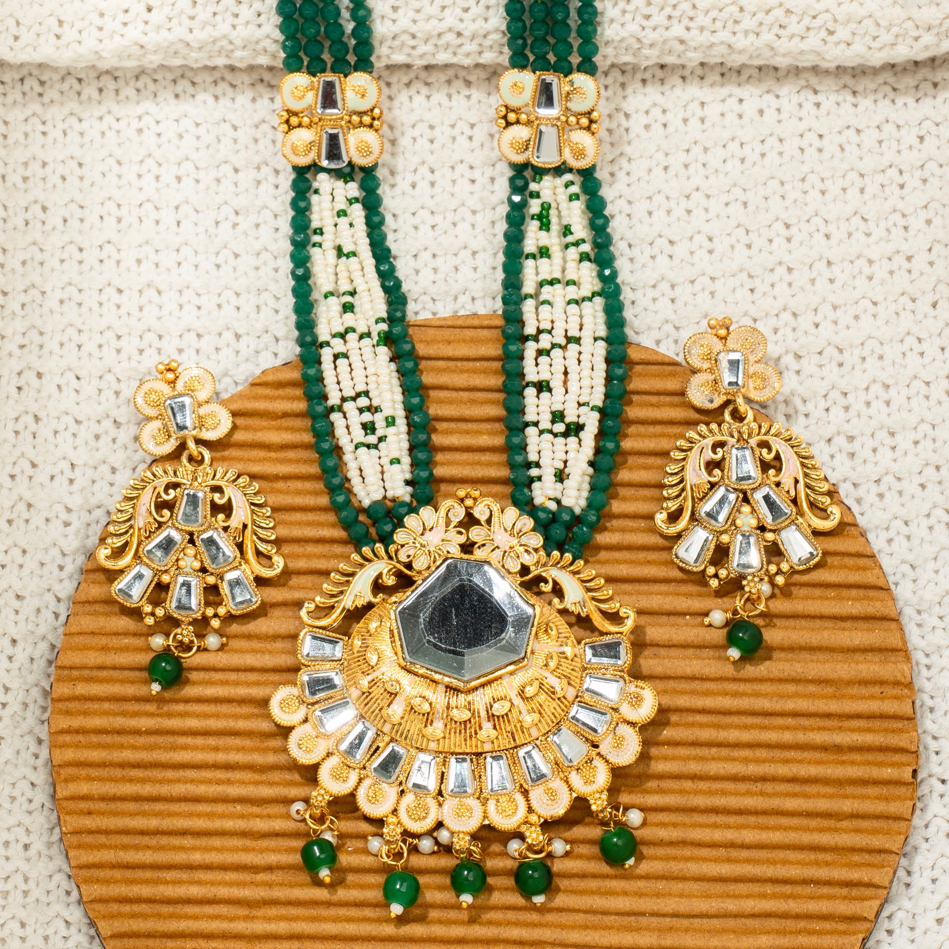 "Emerald Aura Kundan" Necklace & Earring Set, "Forest Jewel Grandeur" Set